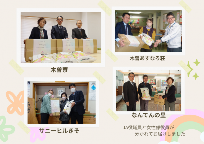 2月24日、食育教育の一環として行った木曽町福島小学校児童による「米作り体験」でJA職員と協同で栽培した米「コシヒカリ」20キロを県立木曽病院へ寄贈しました。「米作り体験」を指導した農業生活部農事園芸課の営農技術員ら4人が同病院を訪れ、児童一人ひとりの病院と入院患者のメッセージを添えた寄せ書きとともに濱野英明院長に手渡しました。